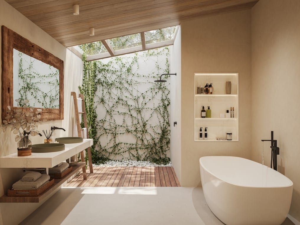If you want to create a complete spa experience, consider adding details like curved bathtubs, wooden surfaces, plush towels, a small vase of flowers and scented candles.