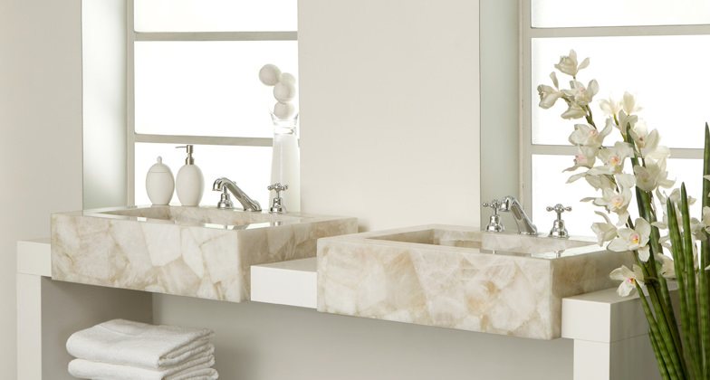 Bathroom sinks can also be crafted from more exotic materials. The sinks below are made from White Quartz which is a semi-precious stone. Caesarstone has launched an entire line of semi-precious stone surfaces called the Concetto and the collection includes exquisite surfaces made from Tiger Eye, Amethyst and Agate.