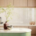 The classic-style structure of the cabinets blends in perfect harmony with the exposed wood of the island and floors. This creates a refined looking kitchen that is both rustic and romantic.