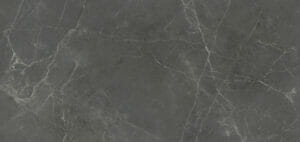 Dark greys blend with warm brown accents, in an intricate array heightened by tiny flecks and oxidisation effects that capture the aesthetic impurities of natural stone, while white organic veins mixed with finer chalky lines give direction and dramatic impact, in Honed finish.