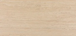 Fine layered bands in the lightest beige tones, which span across the entire surface, are brought to life by white calcite accents and ochre flecks that emphasize a coarse granular complexion, creating alluvial depth and dimension.