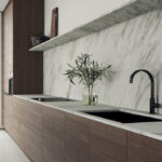 Porcelaine de qualité pour comptoir avec du blanc tendre et du gris saisissant: Les textures sophistiquées, les couleurs sobres et les matériaux naturels simples dans leur forme la plus minimaliste créent un espace nordique lumineux et chaleureux.