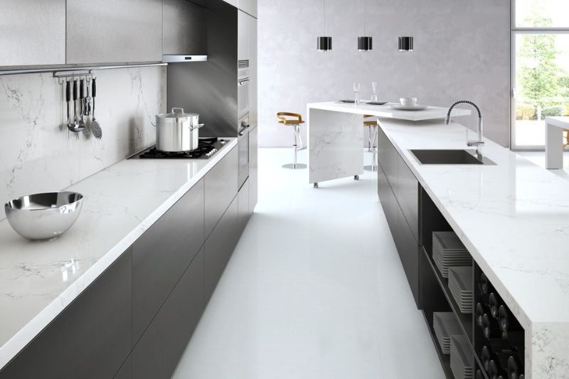 If you have white quartz countertops, you can consider pairing them with a darker quartz backsplash or using a bold pastel colour to make the room ‘pop’.