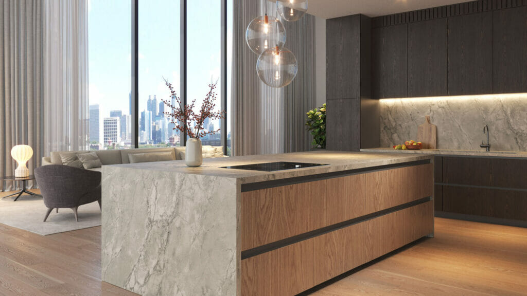 Le quartz et la porcelaine sont des choix populaires pour les matériaux de comptoir, car ils offrent des solutions durables, non poreuses et esthétiques. Le quartz présente un design de tout l’intérieur ce qui signifie que le motif de la surface se poursuit dans toute la dalle. Il offre de vastes possibilités en matière de design, qui imite les veinures profondes et stratifiées souvent observées dans la pierre naturelle. Sa résistance aux égratignures, à la chaleur et aux taches en fait un choix judicieux pour les cuisines, les salles de bain et les comptoirs. Cependant, si vous concevez un espace intérieur/extérieur, les comptoirs en porcelaine sont préférables parce qu’ils sont résistants aux rayons UV et peuvent tolérer une exposition à une chaleur extrême.