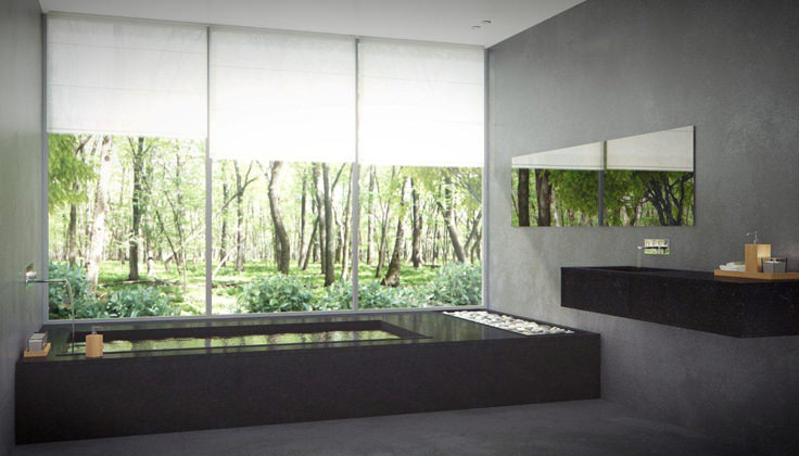 Mentionnons aussi l’amas de galets au bout du bain surdimensionné ainsi que les grandes fenêtres qui laissent entrer la nature. Quant aux miroirs, ils créent un effet de grandeur et reflètent la vue apaisante.