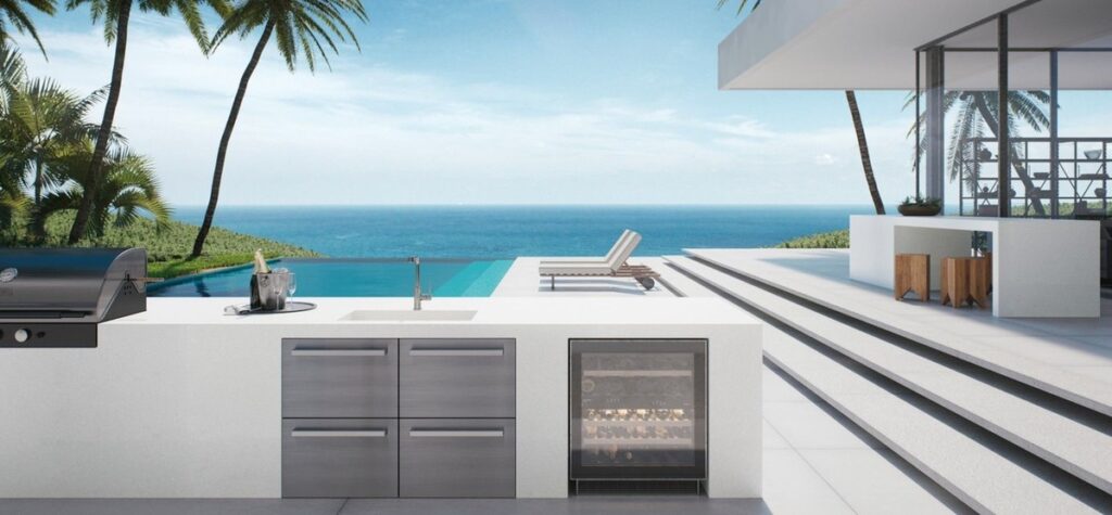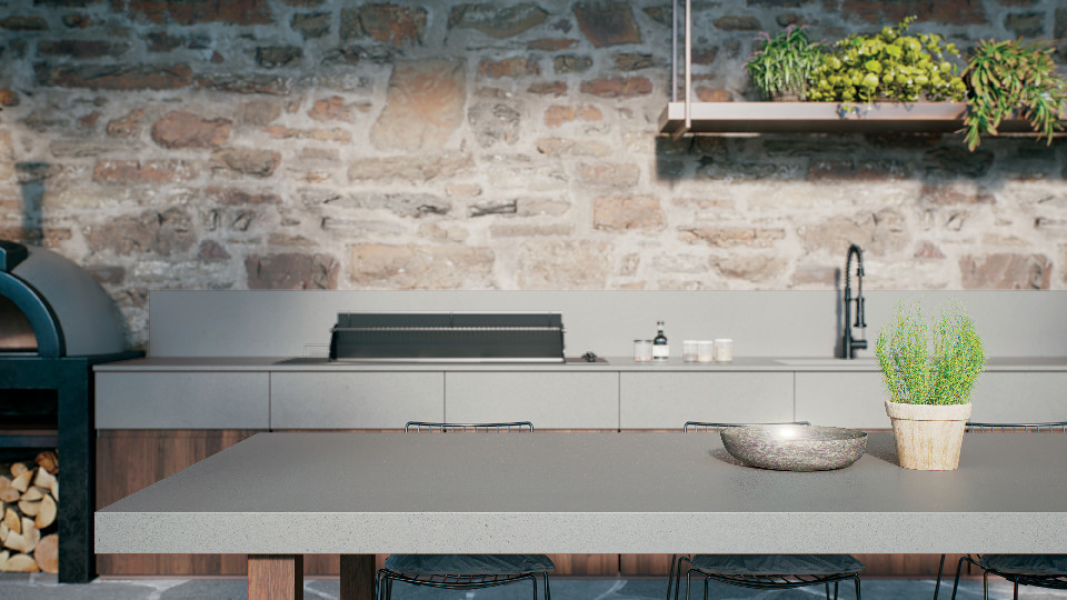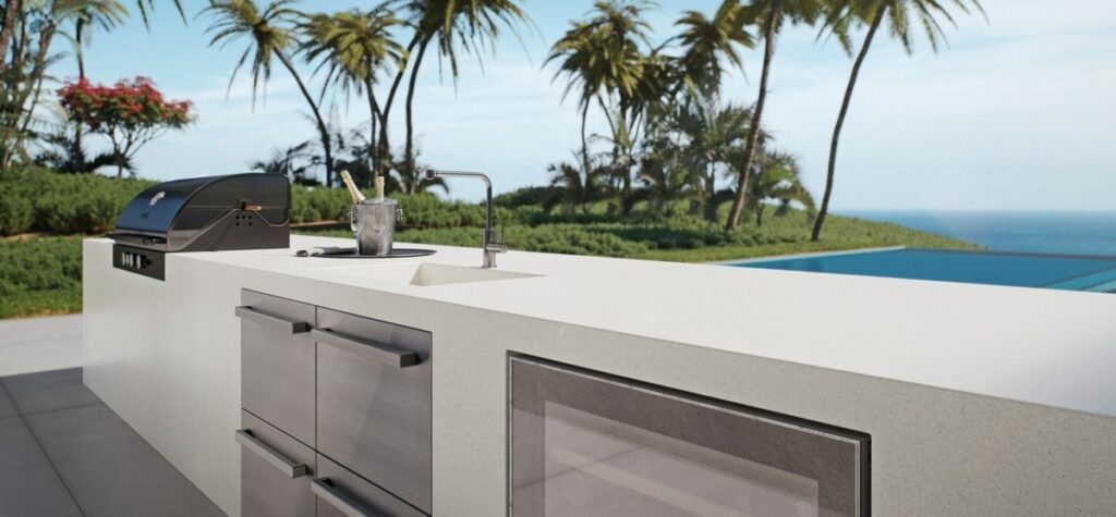 Lorsque vous aménagez une terrasse ou une cuisine extérieure, utilisez du quartz conçu pour cet usage bien précis. En plus de résister aux rayons UV, ce type de quartz résistera à des températures et à des éléments plus extrêmes que ceux que l’on trouve à l’intérieur.