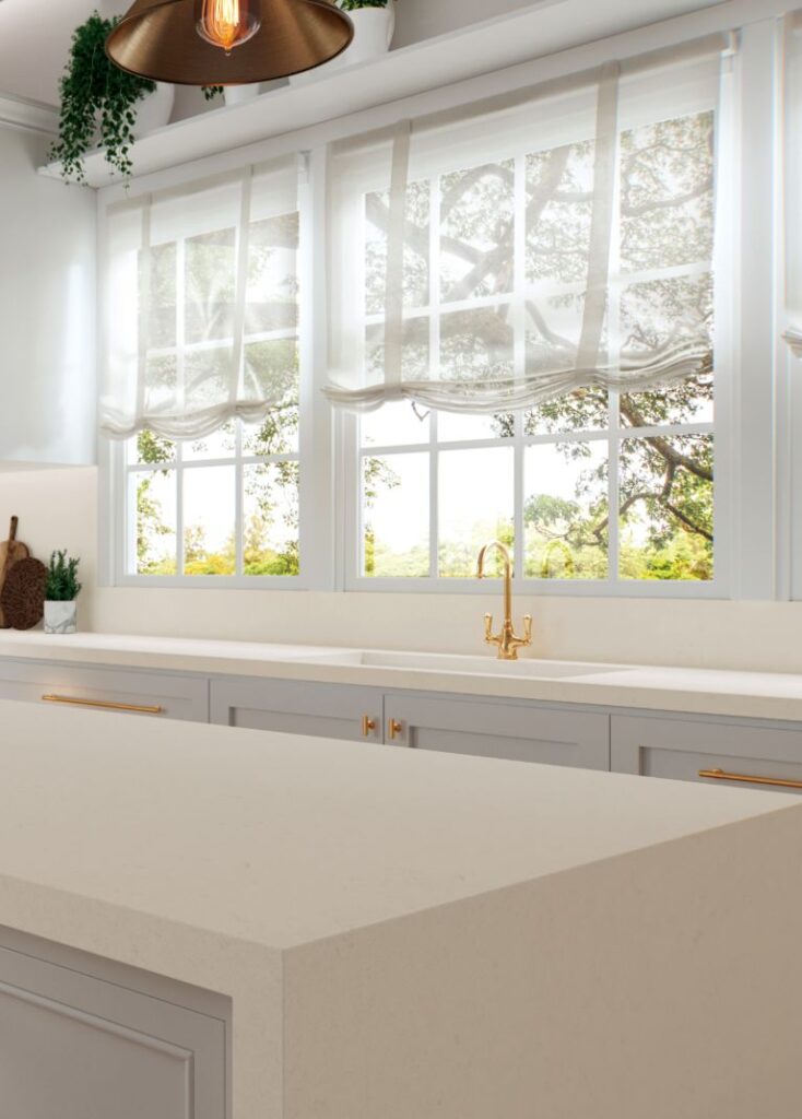 Les propriétaires peuvent agencer des armoires beiges à l’aspect moderne (ou rustique) avec des comptoirs de haute qualité d’un blanc crémeux, comme la pierre 5121 Layalite de Caesarstone. Le beige pâle et les teintes semblables, quand ils sont utilisés correctement, peuvent donner un air spacieux, chaleureux et polyvalent aux cuisines, et ce, même si elles sont petites.