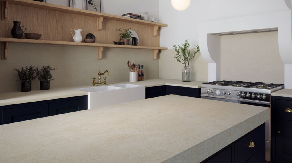Pour obtenir un design minimaliste, nous recommandons la porcelaine de couleur neutre. Les modèles comme 412 Beige Ciment ajoutent de la chaleur et de la texture, tandis que le 504 Lumena comporte des veinures légères et minimales qui ajoutent de la couleur pour équilibrer les espaces de cuisine aux teintes pâles. Les armoires sans poignées renforcent l’esthétique minimaliste, ou vous pouvez utiliser des poignées élégantes pour conserver l’esthétique épurée.