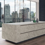 Le revêtement de l'île avec une teinte et une texture uniques correspond au paysage urbain et complète une image minimaliste moderne.