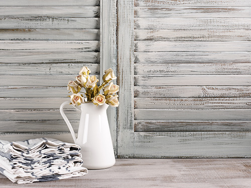 La palette de couleurs rustique combine le blanc, le beige, le gris, le vert, l’ocre et le bleu clair.