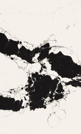 A bright white backdrop richly textured with a juxtaposition of bold oversized black veins, meandering in a granular stream of dark minerals and brownish deposits that shift, burst, and rupture with an organic tempo.